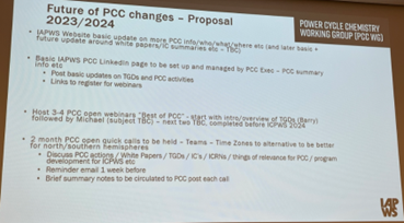 In PCC the discussion of the future of PCC was on the agenda and especially the communication about what PCC is working on was discussed. On the IAPWS website, there is not a lot of information about what PCC is all about, and there is not a lot of communication from PCC in between the annual meetings. The result from the discussion is that PCC will initiate 3-4 webinars in the coming year and on the IAPWS website there will be a section added for the PCC (and the other working groups; TPWS, PCAS, TSR and SCSW). Another thing that will be produced is some general information in ppt. format about the PCC work, so the National Groups have the same information to share with their members.